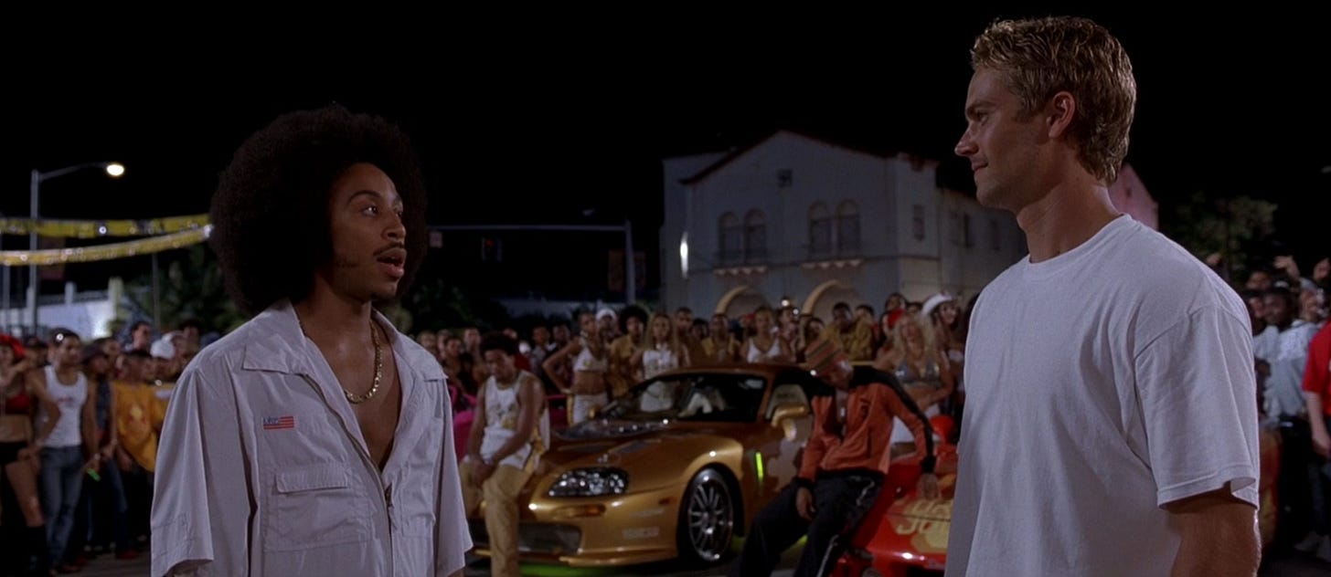 2 Fast 2 Furious has gone down in history as the movie called 2 Fast 2 Furious, a sequel defined by its listless sequel-ness. In it, we find the still-improbably named "Brian" living on a houseboat in Miami with a two-liter of Pepsi and a Foreman grill, scratching together a living through street-races and gigwork(?) as an undercover cop. You have questions, and the answer is cars, motherfucker. Incoming director John Singleton presents the driving sequences as digital composites, anticipating the celebrated setpieces of the Wachowskis' later Speed Racer reboot in pure cartoonish unreality. Somehow, by and large, it still works -- the hideous automobiles, the lurid rap-rock, the way Paul Walker says "bruh" -- at least well enough to facilitate several additional soft reboots. How refreshing, in 2021, to visit a franchise with no masterplan, just doddering forward and falling dick-first into 300% ROI, over and over again. Talk about failing upward! For me, at least, the film's greatest moment is extratextual: the electric charge in the air when Tyrese and Ludacris's characters meet, barely acknowledging one another's existence, and yet doomed to banter for decades to come. How unplanned is love, is life itself!